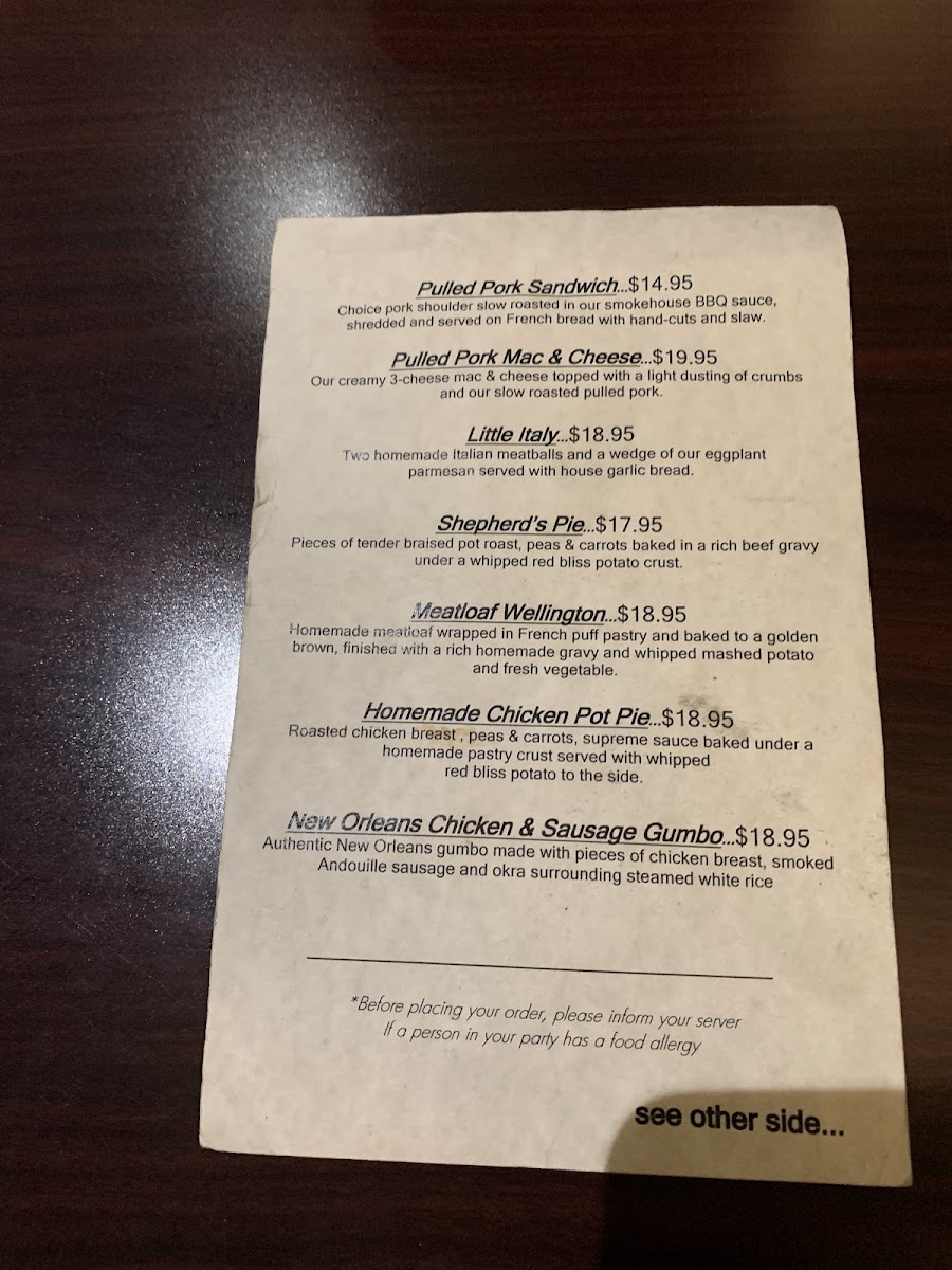 Choice beef marinated for 3 days in fresh herbs and red wine, braised until fork tender topped with a rich gravy and ground gingersnaps. Served with potato pancake and sauteed apple cabbage